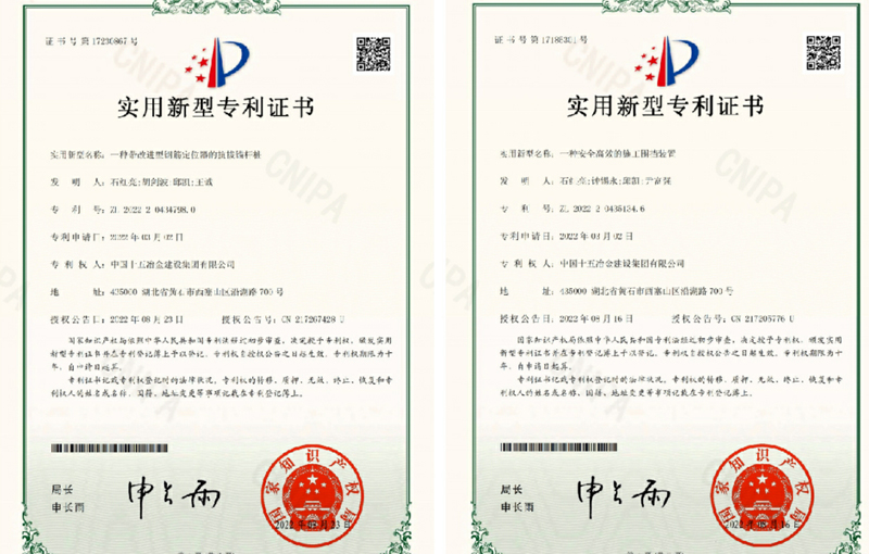 近日,從國家知識產(chǎn)權(quán)局傳來喜訊,中國有色集團(tuán)出資企業(yè)中國十五冶金建設(shè)集團(tuán)有限公司(簡稱:中色十五冶)一公司黃石科創(chuàng)項目《一種帶改進(jìn)型鋼筋定位器的抗拔錨桿樁》《一種安全高效的施工圍擋裝置》技術(shù)項目,榮獲國家實(shí)用新型專利授權(quán)。至此,包括2021年獲得國家專利證書的《一種搭設(shè)在地下室底板混凝土內(nèi)的腳手架鋼筋支撐》《一種灌注樁的快速試樁樁帽成型裝置》,該項目部已有4項技術(shù)成果獲國家專利。