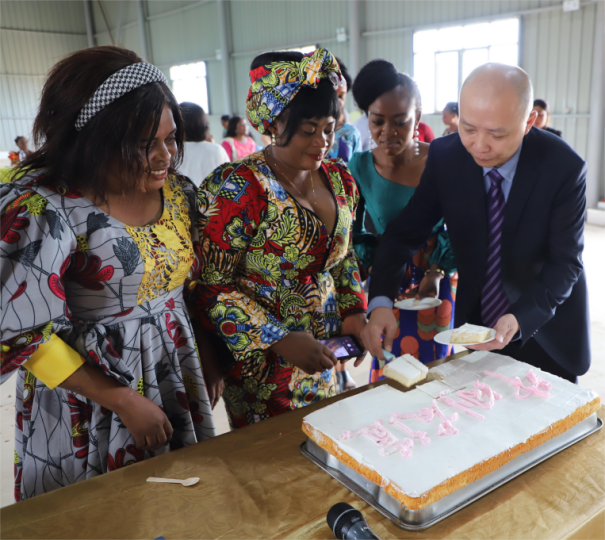 活動(dòng)中,中色剛果有關(guān)領(lǐng)導(dǎo)同志與剛方員工一起切下見證中剛友誼的蛋糕,在音樂中一起舞蹈,眾人在歡聲笑語中共同慶祝了“三八”國(guó)際勞動(dòng)?jì)D女節(jié)。