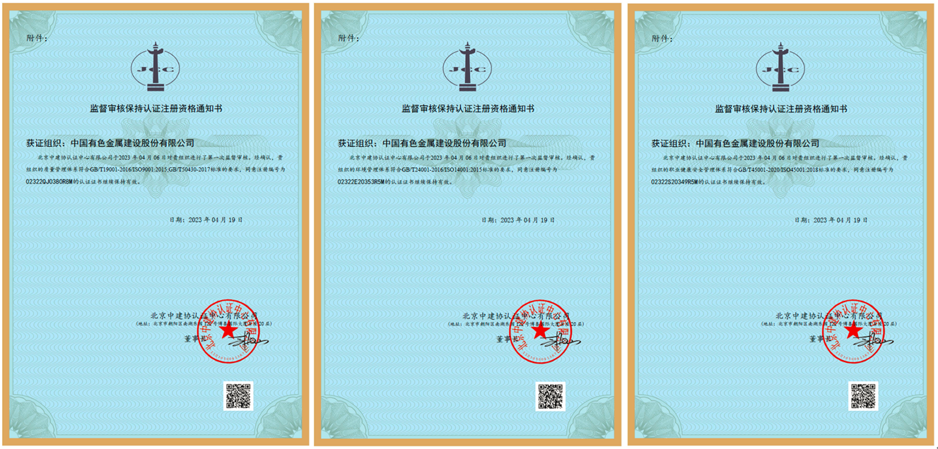 近日,北京中建協認證中心有限公司(以下簡稱中建協)對中國有色集團出資企業(yè)中國有色金屬建設股份有限公司(簡稱:中色股份)進行了2022-2023年度質量、環(huán)境和職業(yè)健康安全管理體系監(jiān)督審核。經過兩天審核,中建協審核組充分肯定了中色股份體系運行的有效性,審核未開具不符合項,審核組一致同意推薦公司通過審核。經中建協內部技術評定,為中色股份頒發(fā)了三體系監(jiān)督審核保持認證注冊資格通知書,標志著中色股份順利通過了三體系監(jiān)督審核。