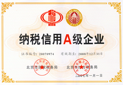 喜報(bào)!2007年1月30日,在北京市近 10萬多家企業(yè)中,經(jīng)層層篩選后,我公司經(jīng)過納稅人員的精心準(zhǔn)備,在北京僅僅只有2000家、豐臺(tái)區(qū)只有113家被評(píng)為A級(jí)企業(yè)中,我公司獲得了該項(xiàng)榮譽(yù),并名列前茅。正式被國家稅務(wù)機(jī)關(guān)評(píng)定為納稅信譽(yù)A級(jí)企業(yè),證書編號(hào)為20070974 ,有效期為2007年1月1日-2008年12月31日。