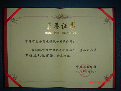 7月7日,由《中國證券報(bào)》和亞商企業(yè)咨詢公司聯(lián)合主辦的“2007上市公司百強(qiáng)論壇”在北京舉行,并于會上對日前評選出的“2006年中證百強(qiáng)上市公司”進(jìn)行了頒獎(jiǎng),作為有色金屬行業(yè)的優(yōu)秀上市公司代表,中色股份公司獲此殊榮。