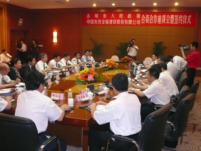 2007年7月13日,中國有色金屬建設(shè)股份有限公司與內(nèi)蒙古自治區(qū)赤峰市人民政府在赤峰市簽署了《赤峰市人民政府與中國有色金屬建設(shè)股份有限公司合資合作協(xié)議》。赤峰市市委書記杭桂林、市長徐國元、市委副書記趙興、市委常委包振玉、市人大常委會副主任寶敬群、副市長張利平、政協(xié)副主席李玉春等赤峰市委市政府領(lǐng)導(dǎo)出席了簽字儀式;中國有色礦業(yè)集團(tuán)有限公司總經(jīng)理、中色股份董事長羅濤、中色股份總經(jīng)理王宏前、中色股份黨委書記、副總經(jīng)理謝亞衡等出席了簽字儀式。
