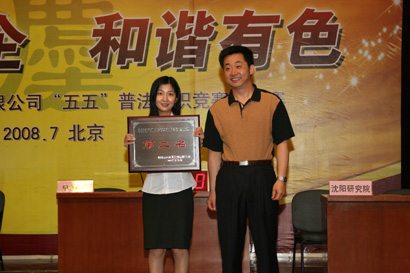 2008年7月3日,中國有色集團(tuán)在北京隆重舉行“五五”普法知識(shí)競賽,經(jīng)過預(yù)賽和決賽的激烈角逐,由商運(yùn)中心辛元洲、貿(mào)易中心呂寧馨、霞石項(xiàng)目部吳曉華組成的中色股份代表隊(duì)取得了決賽第二名的好成績,三位選手用出色的表現(xiàn)展示了中色股份前一階段時(shí)間的普法工作成就。