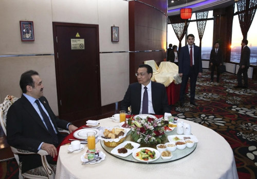 李克強(qiáng)與馬西莫夫在北京大廈共進(jìn)早餐。